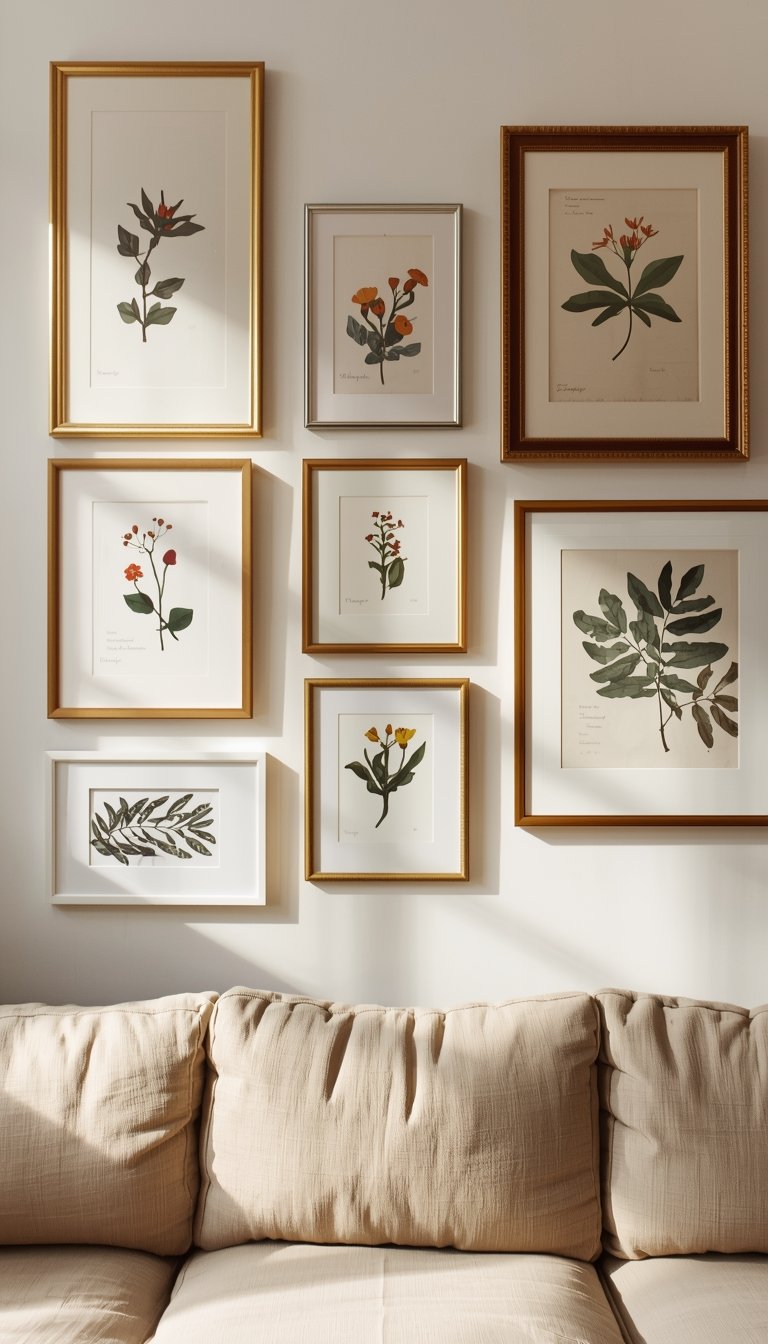 You don’t need to spend a fortune. Sites like Etsy, Creative Market, and even free resources like Unsplash offer stunning botanical digital prints you can download and print at home for under a few dollars each. Lay your arrangement out on the floor before committing anything to the wall — adjust until the spacing feels balanced and the overall shape (rectangle, grid, or organic cluster) works with your wall dimensions. Use a laser level or painter’s tape template on the wall for precise hanging. The result is a bespoke, high-end wall installation that cost a fraction of what it looks like.