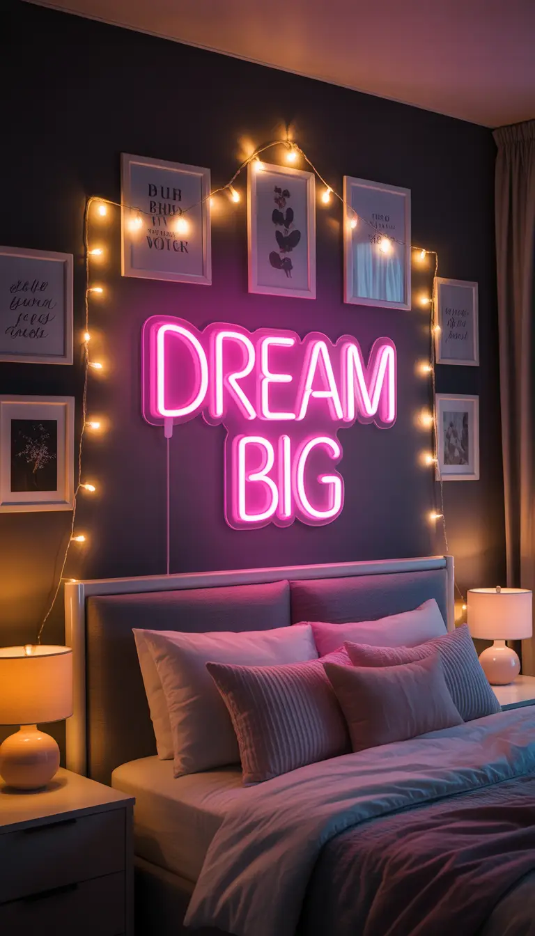 Choose a phrase or symbol that genuinely reflects your personality or what inspires you — not just what looks trendy. Position your neon sign on a dark-painted accent wall or above your desk or bed for maximum drama. Surround it with elements from your gallery wall for a layered, editorial look. When paired with your fairy lights and LED ambiance setup, a neon sign becomes the glowing centerpiece of your entire aesthetic — the thing every visitor will immediately notice and remember.