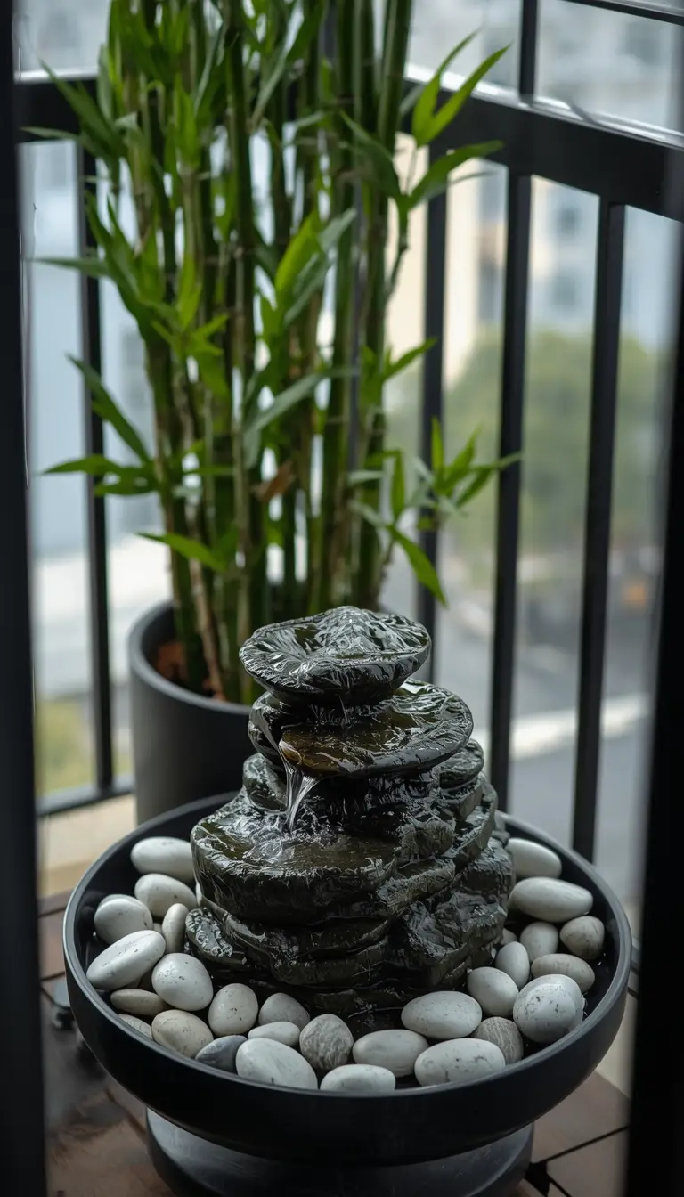 A small water feature is the most unexpected and impactful upgrade on this entire list — and almost no one thinks to add one to an apartment balcony. The sound of trickling water masks street noise and creates a sensory experience that makes your outdoor space feel genuinely restorative, like a spa or a meditation garden. Solar-powered tabletop fountains are perfect for apartment use: no wiring, no plumbing, no landlord issues. Place one on your bistro table or a dedicated plant stand, surrounded by smooth river stones and a few bamboo stalks in a tall planter for an effortless Zen aesthetic.