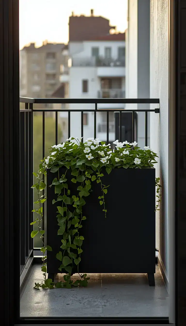 A railing planter box is the most architecturally satisfying way to add greenery to a small balcony. Unlike floor planters, railing boxes sit at the threshold between your space and the outside world — they frame your view rather than filling it. Choose a slim matte black or raw corten-look box that clips directly onto your railing with no tools required, and fill it with a mix of trailing plants: ivy, bacopa, or sweet potato vine in dark-leaf varieties. The trailing habit softens the hard edge of the railing beautifully.