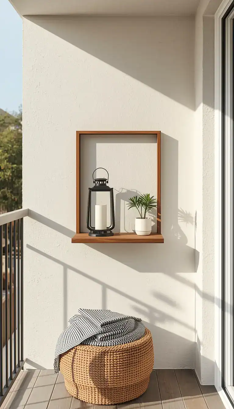 On a small balcony, horizontal surfaces are precious — and a slim wall-mounted shelf doubles your usable surface area without adding a single thing to your floor plan. Mount a simple teak or powder-coated steel shelf at seated eye-level and allow yourself only three items on it: a candle lantern, one small plant, and something personal like a folded throw or a ceramic bowl. Three items. That’s the rule. The constraint isn’t about limitation — it’s about ensuring everything on your shelf is something you genuinely love.